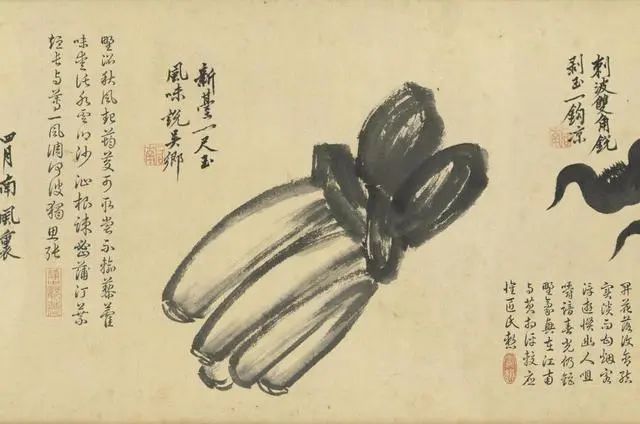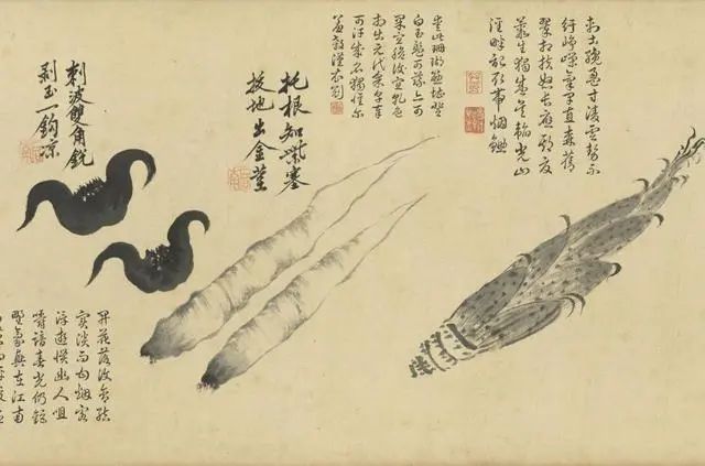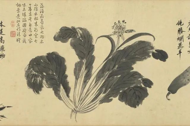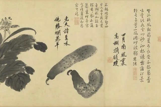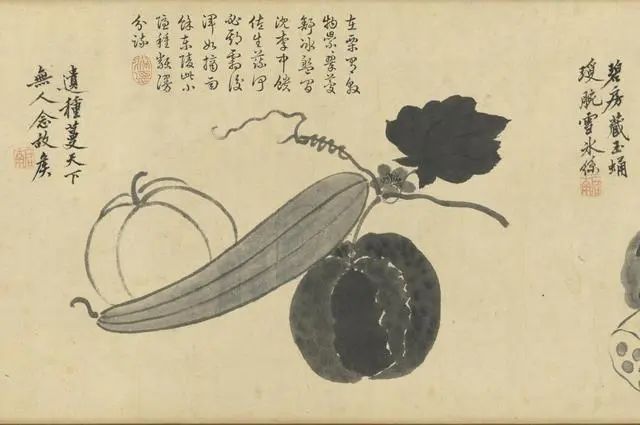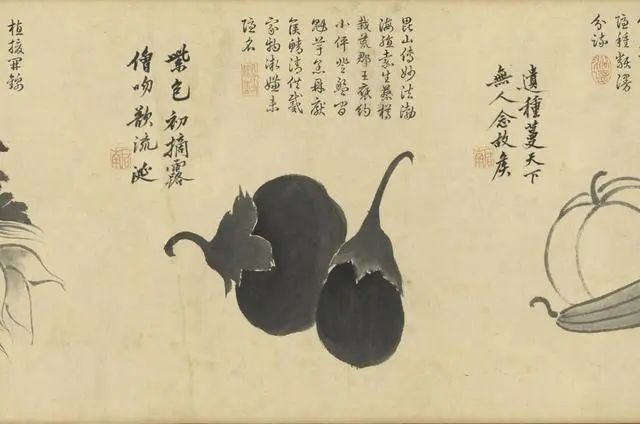 《写生卷》是沈周的一幅花鸟画长卷,全卷以没骨画法写出,内容包含了花草、果蔬、飞禽、走兽等多种元素,共计二十四段。每段旁边都有沈周的款识和乾隆的题诗,足见其珍贵程度。此卷不仅是沈周花鸟画的精品之作,更是中国绘画史上的瑰宝之一。